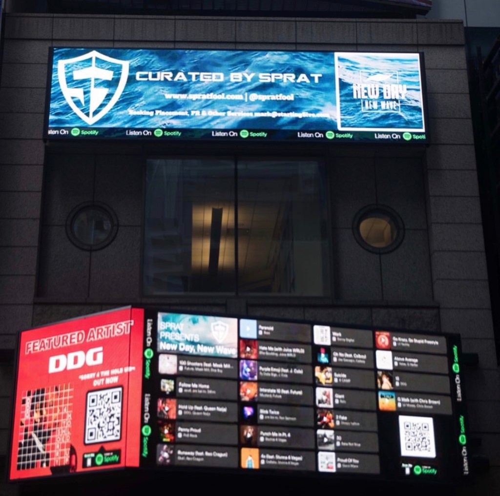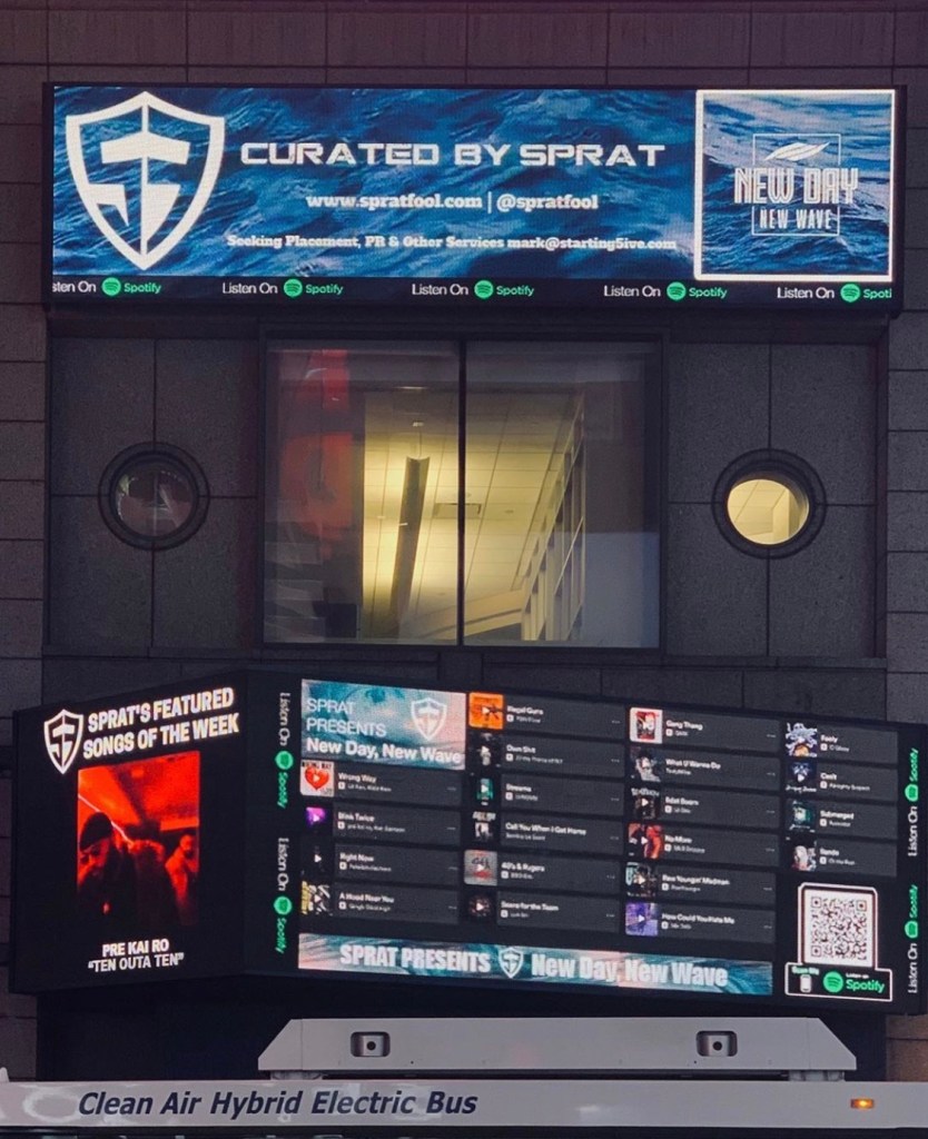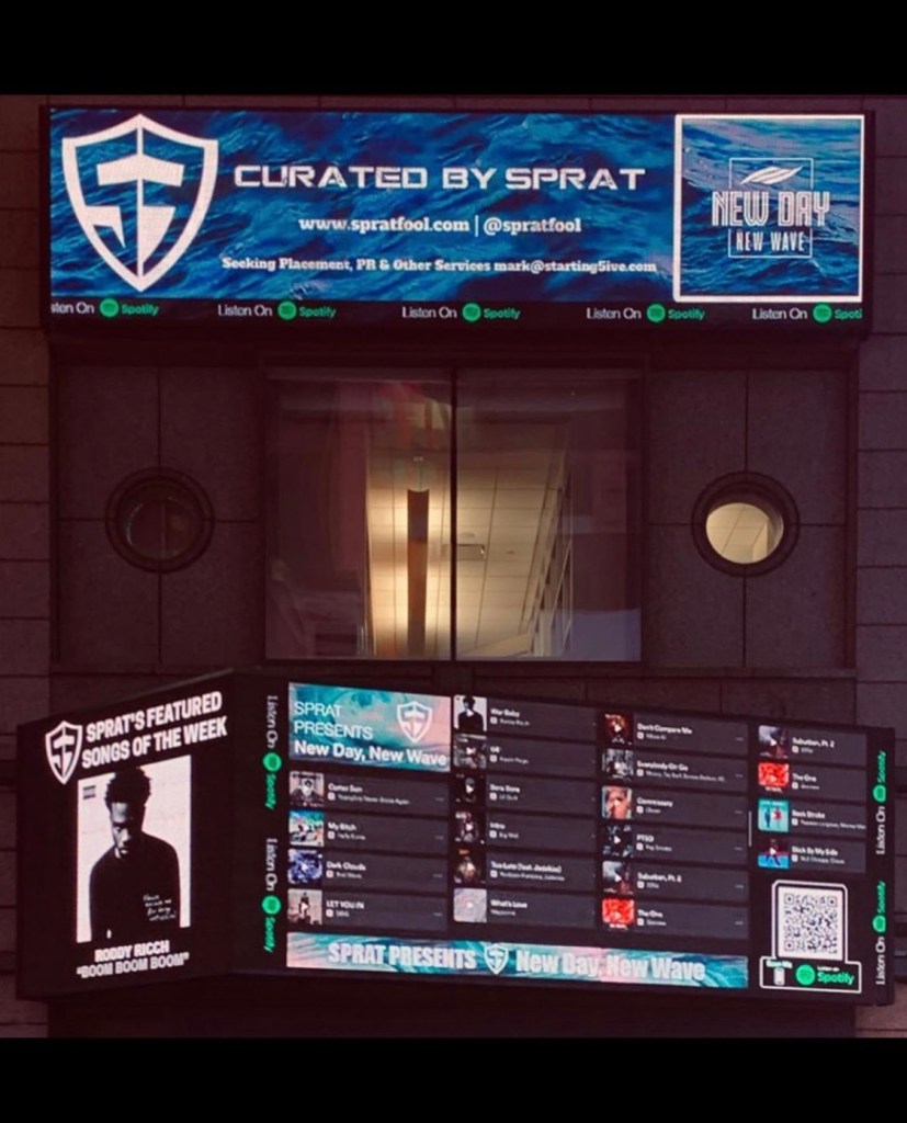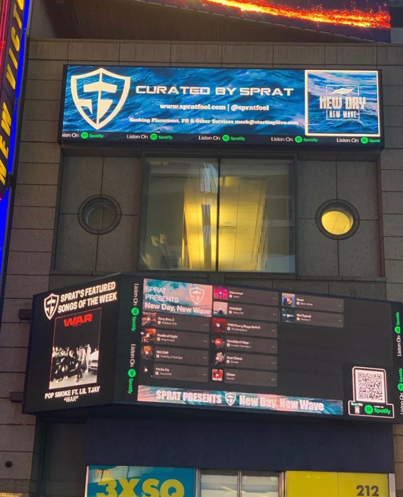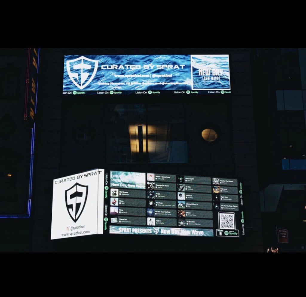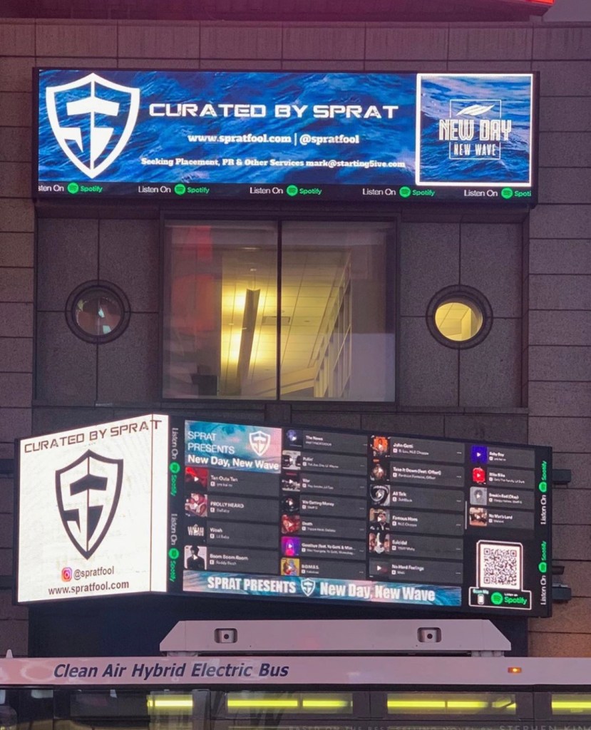 With the simple idea of taking a playlist to the next level, Mark Spratley AKA “SpratFool” has taken his Spotify playlist to the billboards. Instead of creating an ordinary playlist, Spratley decided to take his savvy marketing concepts to the next level by adding his “New Day, New Wave” playlist to a live billboard in Times Square, New York City. Now you can catch his coveted and highly curated playlist up high in the New York City lights, showcasing new music from countless artists bi-weekly.